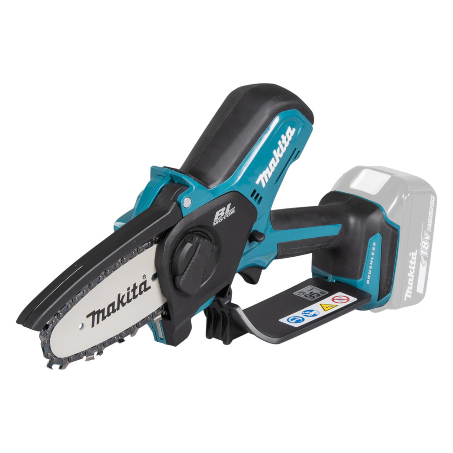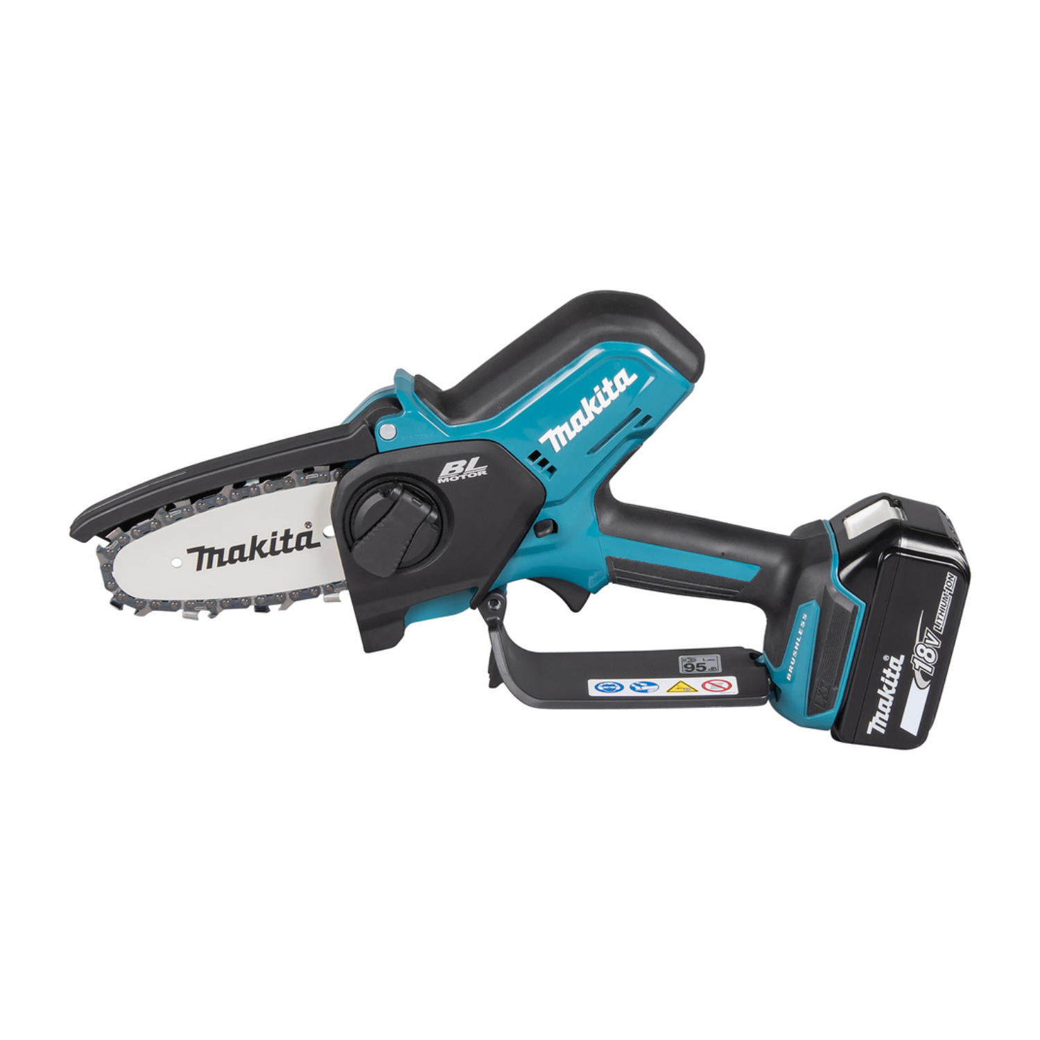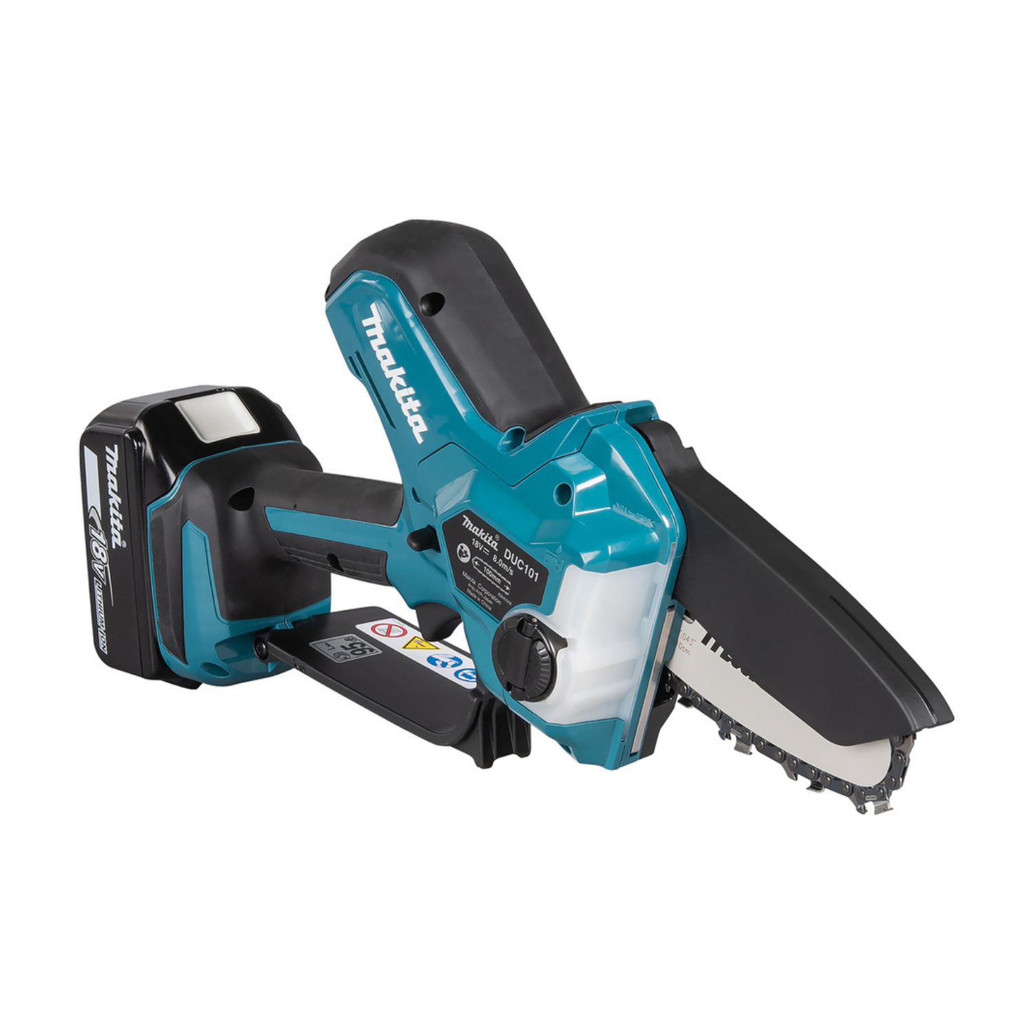 Eine kompakte Akku-Kettensäge mit einer Kettengeschwindigkeit von 8 m/s. Ausgestattet mit einer 10 cm Schiene und werkzeugloser Kettenspannung. Der bewegliche Schutz deckt die Oberseite des Schwerts ab und öffnet sich weiter, wenn die Sägekette tiefer schneidet.