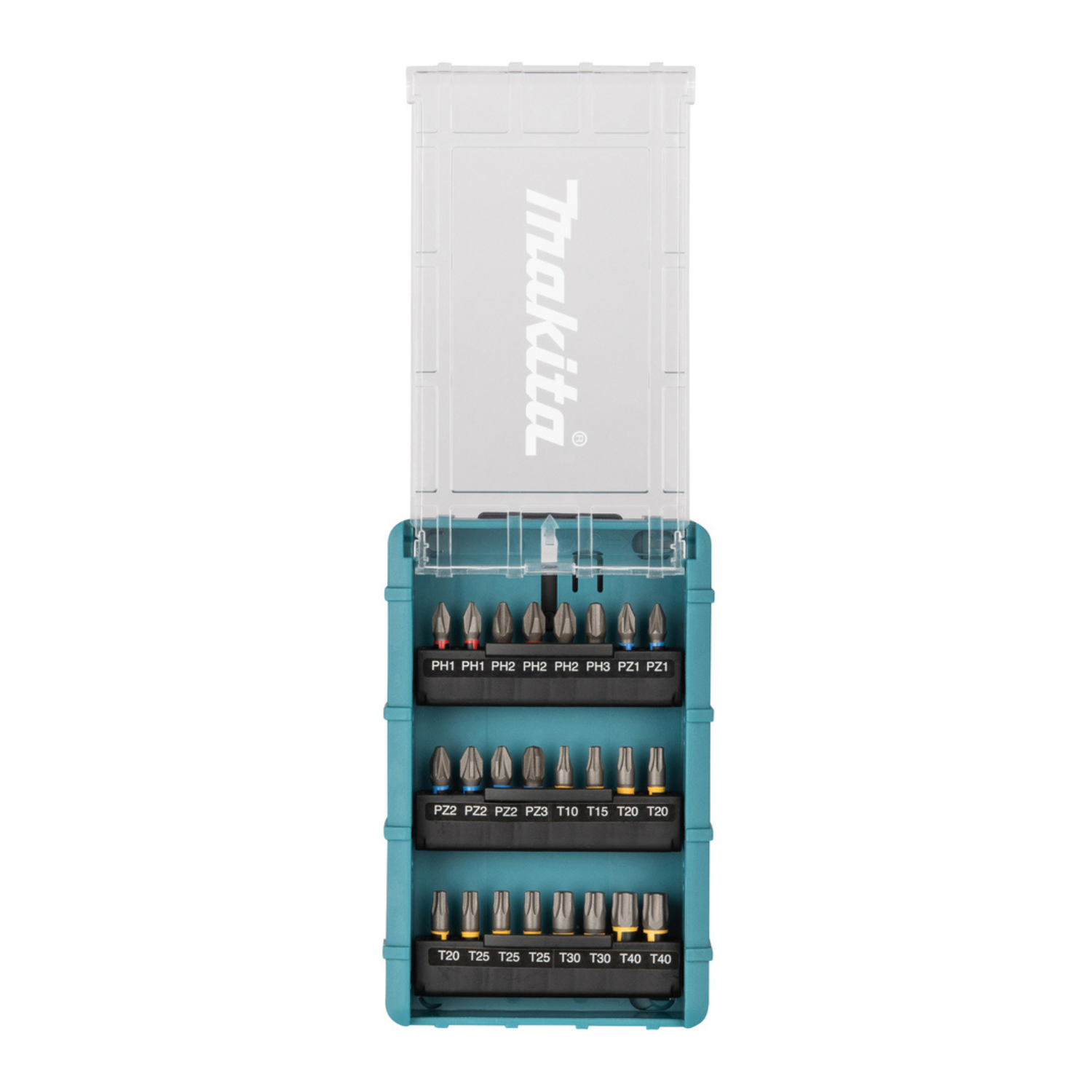 Inhalt: Schraubbits: PH1, PH2, PH3, PZ1, PZ2, PZ3, T10, T15, T20, T25, T30, T40, Impact Bit-Halter und Impact-Steckschlüsseleinsätze.